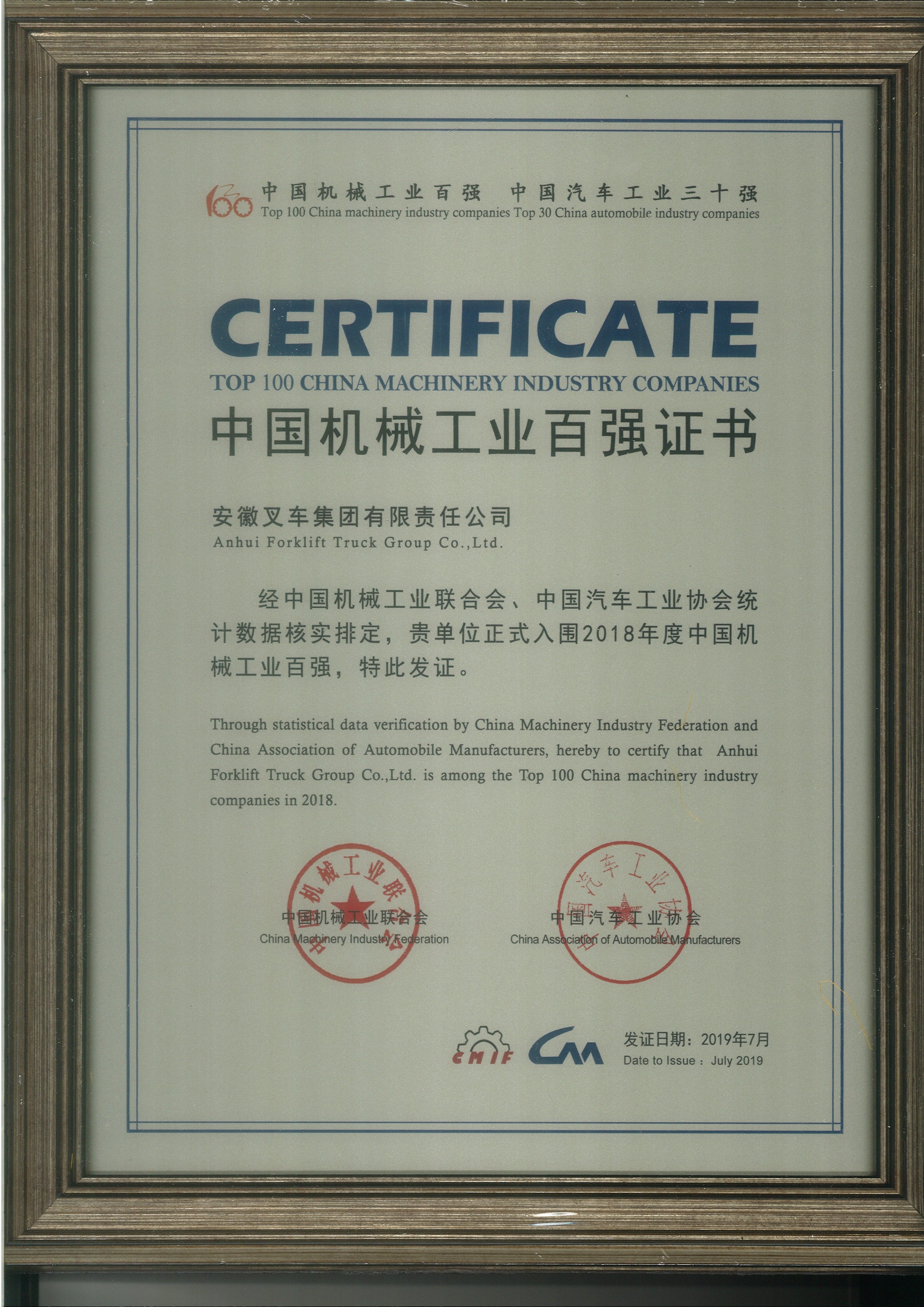 2020 中國機(jī)械工業(yè)百強(qiáng)證書