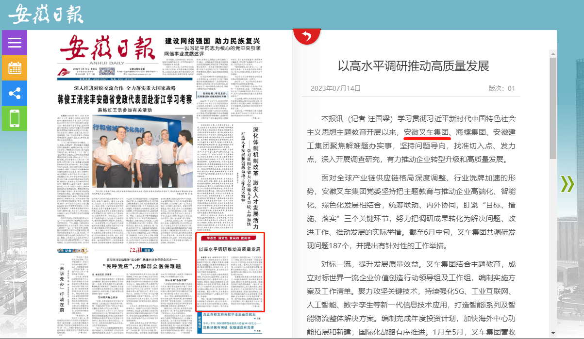 《安徽日?qǐng)?bào)》報(bào)道安徽叉車(chē)集團(tuán)以高水平調(diào)研推動(dòng)高質(zhì)量發(fā)展情況